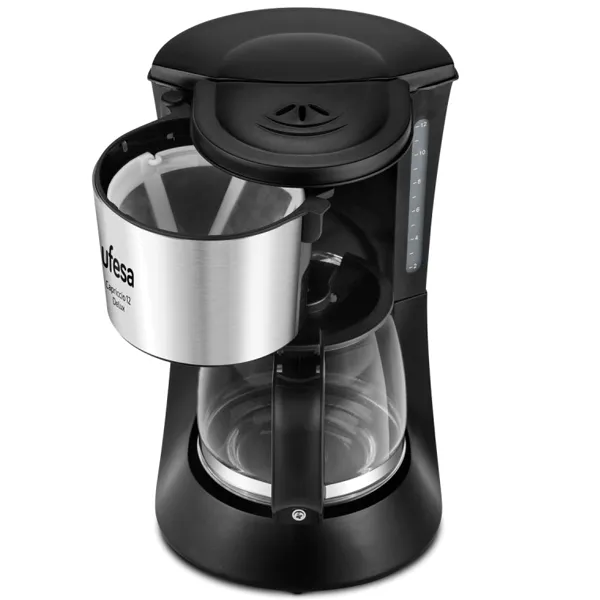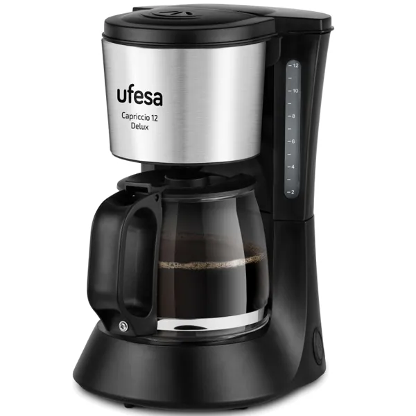 Potência: 680W Capacidade: 12 chávenas / 1,2lts Suporte de filtro giratório e removível Filtro permanente Válvula antigota Placa de aquecimento antiaderente Desconexão automática Colher doseadora