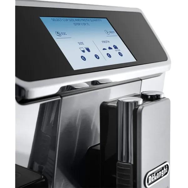 Dimensões (lxpxa cm): 26x48x37,5 Peso (Kg): 12,5 Doppio + Voltagem/Frequência (V~Hz): 220-240 V / 50-60 Hz Potência (W): 1450 Cor: Metal e preto Capacidade do depósito de grãos de café (g): 400g Nível do dispensador mínimo/máximo: 90-142 mm Pressão (bar): 19 Reservatório para borras da café (nº): 14 Função Café LONG Controlo de aroma Sinal sonoro Limpeza automática Desliga-se automaticamente Função de chocolate com jarro exclusivo Apto para café moído Superfície para chávena Iluminação das chávenas De´Longhi LatteCrema System Programa de descalcificação, limpeza e enxaguamento Visor: 4,3 TFT Display touch a cores Função poupança de energia Dispositivo extra cappuccino Sistema IFD Novo moinho silencioso com 13 níveis de moagem Interruptor geral Temporizador para ligar automaticamente Dureza da água programável Bandeja recolhe-gotas com indicador do nível de água Unidade de infusão removível Depósito de água removível Seleção para 1 chávena Seleção para 2 chávenas Função Standby Jarro térmico de leite Filtro de água