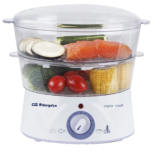 Cozedor a vapor de 2 recipientes e um recipiente especial para arroz.Lavável em máquinas de lavar loiça. Temporizador de 60 minutos. Desligamento automático.Capacidade 5 litros. Visor do nivel de água. Potência 400W Ligação: 230 V – 50 Hz.