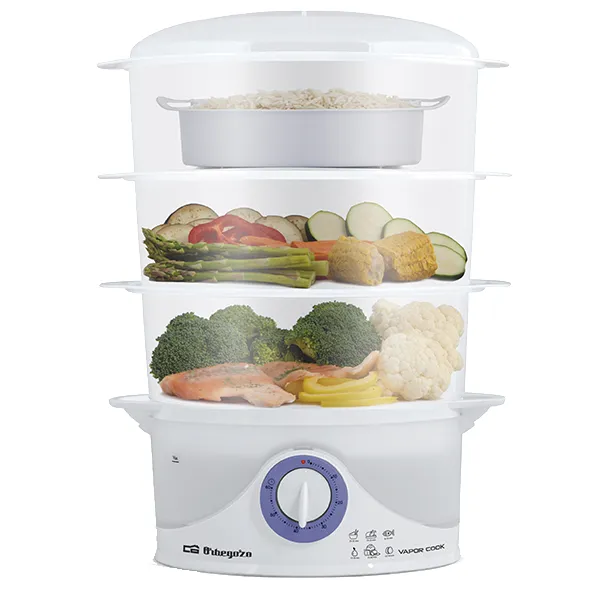 Cozedor a vapor de 3 recipientes empilháveis e um recipiente especial para arroz. Livre de Bisfenol A. Lavável em máquinas de lavar loiça. Temporizador de 60 minutos. Paragem automática. Capacidade dos recipientes de 9 litros. Suporte para cozer ovos. Visor do nivel de água e capacidade de 1L. Paragem automática com sinal acústico. Potência 800W Ligação: 230 V – 50 Hz.