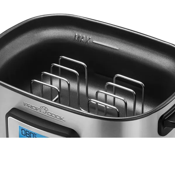 Revestimento em inox Cozedura precisa com controlo de temperatura electrónico (desvio máx. +/- 0.5ºc) Vitaminas, nutrientes e sabores retidos Função cozedura suave/lenta, preparação iogortes e manter temperatura quente Visor LCD (iluminação azul) Temperaturas: 45º a 90º Temporizador 72h 8.5l de capacidade Tampa com janela larga para fácil visualização Incui: pinça e suportes inox para colocar os alimentos em vácuo 220-240V, 50/60Hz, 520W