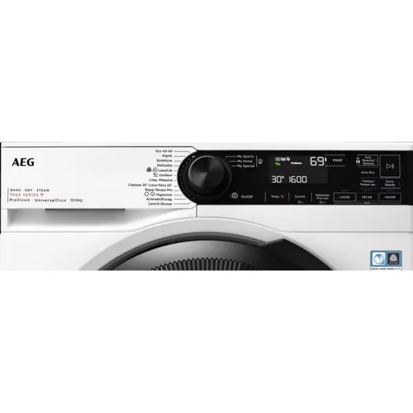 Programas de lavagem: Eco 40-60, Algodões, Sintéticos, Delicados, Lãs/Lavagem à mão, Desporto, Limpeza da Máquina, Quick 20 Wash&Dry 60, Carga Mista, Hygiene, Enxaguamento, Centrifugação / Drenagem