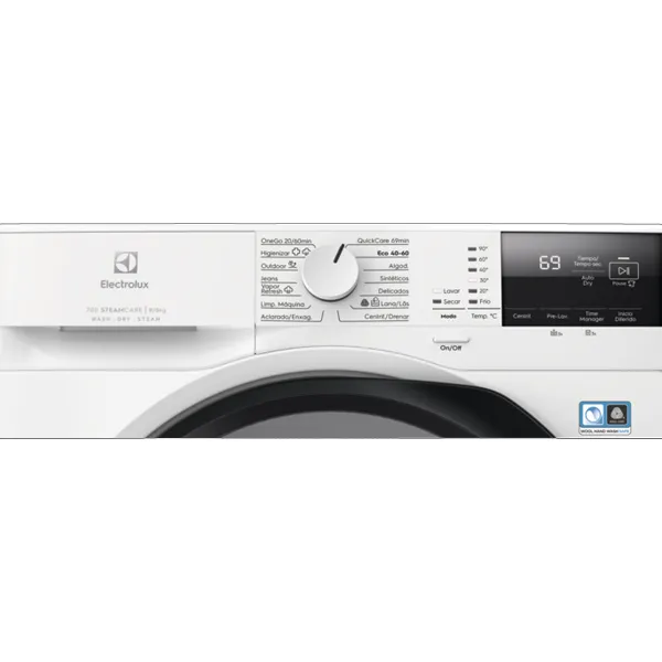 Programas de lavagem: QuickCare 69min, Eco 40-60, Algodões, Sintéticos, Delicados, Lãs, Centrifugação / Drenagem, Enxaguamento, Limpeza da Máquina, Refrescar a vapor, Jeans, Desporto, Hygiene, OneGo 20/60min