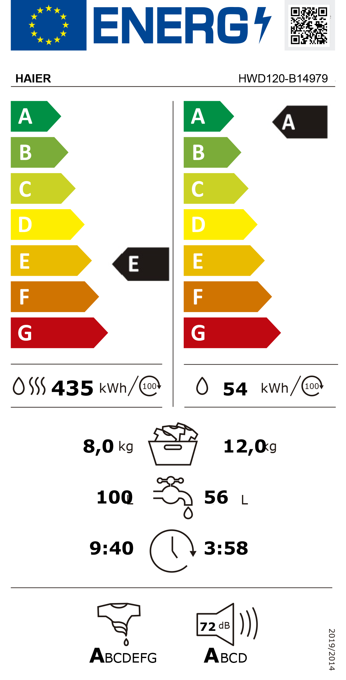 Capacidade de algodão (kg) de lavar: 12 Capacidade de secagem de algodão (kg): 8 Velocidade máxima de centrifugação (rpm): 1400 Motor: Direct Motion Tipo de ficha: Schuko Voltagem (V): 220-240 Número de programas: 14 Opções de início diferido (até 24h) Vapor Cor/Material do corpo: Branco Classe de eficiência energética EEIw: A Classe de eficiência energética EEIwd: E Classe de eficiência de centrifugação: A Consumo de energia ponderado [100 ciclos W]: 54 Consumo de energia ponderado [100 ciclos LS]: 435 Eco 40-60 Duração Completa: 238 Duração de lavagem e secagem completa: 580 Nível de ruído fiação Energia classificação energética EN 60704-3: 72 Classe de emissão de ruído acústico aerotransportado: A Consumo de água na lavagem: 56 Consumo de água L+S: 100 Altura: 85cm Altura com tampo (mm): 850 Largura: 60cm Profundidade: 60cm