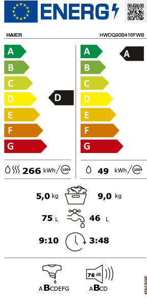 Consumo de energia – lavagem/secagem: 266 kWh/100 cliclos