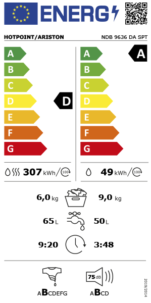 Classe de eficiência energética do ciclo de lavagem/secagem : D Classe de Eficiência Energética do Ciclo de Lavagem (Regulação (EU) 2017/1369) : A Consumo ponderado de energia em kWh por 100 ciclos de lavagem do programa eco 40-60 : 49 O consumo de água do ciclo de lavagem e secagem completo em litros por ciclo : 65 A velocidade de centrifugação em rpm do programa eco 40-60 à capacidade nominal : 1351 Emissão de ruído aéreo : 75 Tipo de Instalação : Livre Instalação Tipo de carga : Carga Frontal Capacidade máxima em kg num ciclo de lavagem : 9 Capacidade máxima em kg num ciclo de lavagem/secagem : 6 Cor : Branco Cor da porta : Porta Dialogic Peso (kg) : 66 Tipo de display : Digit Pés ajustáveis Programas: Sintéticos; Lãs; Rápido 30´; Delicados; Enxaguamento +; Centrifugação; Centrifugação + Descarga; Antialérgico; Algodão; Eco 40-60; 20°C Altura (cm) : 85.0 Largura (cm) : 59.5 Profundidade (cm) : 54.0