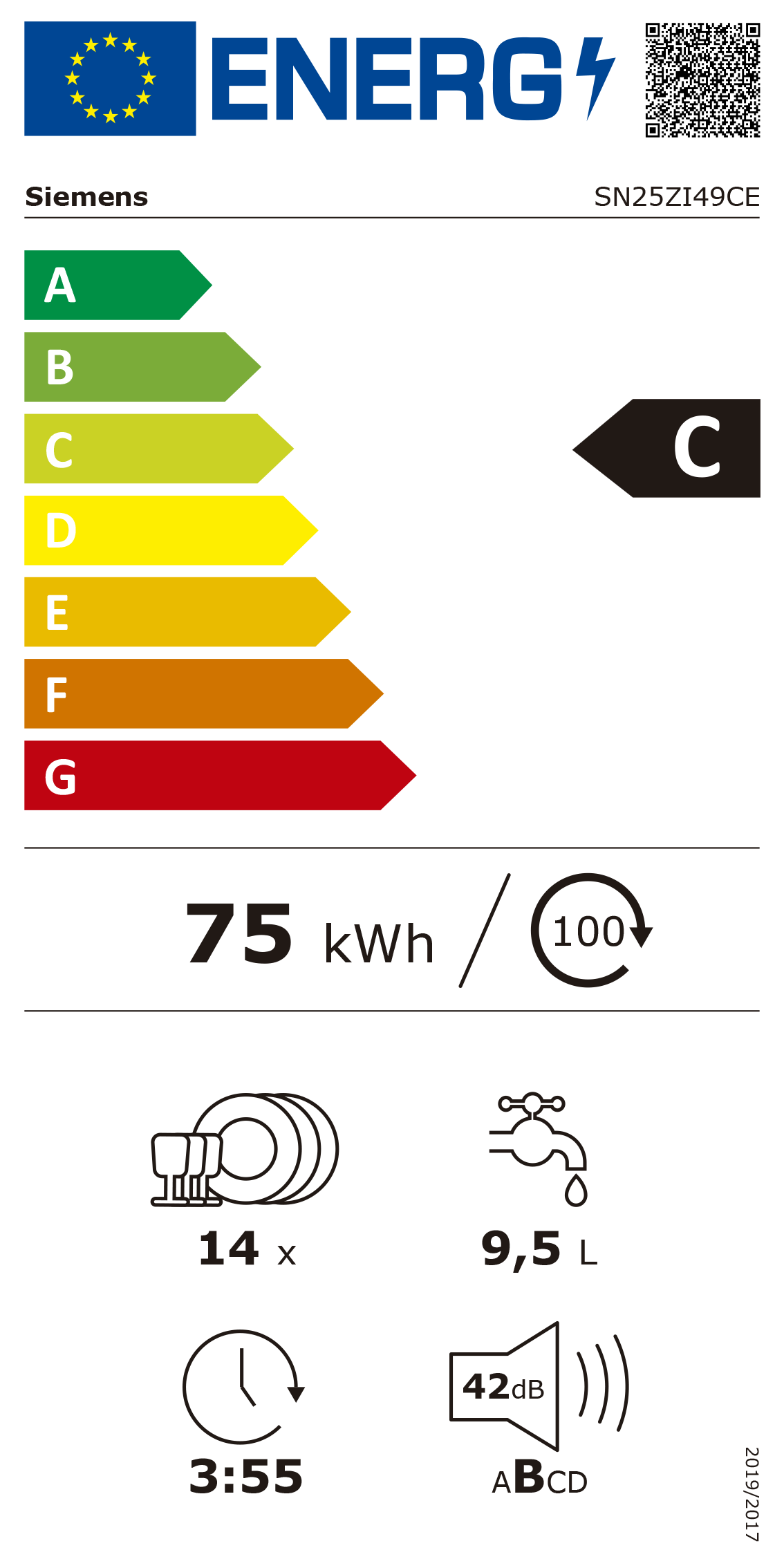 Energia / Água: 75 kWh / 9.5 litros