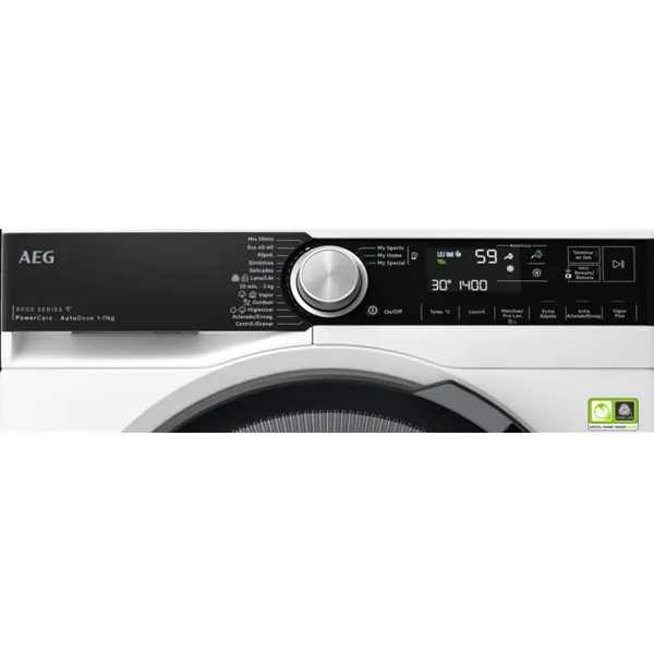 Programas de lavagem: PowerClean 59min, Eco 40-60, Algodões, Sintéticos, Delicados, Lãs, 20Min 3Kg, Vapor, Desporto, Hygiene, Enxaguamento, Centrifugação / Drenagem