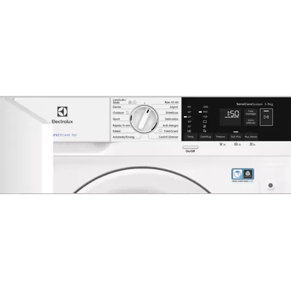 Funções: Ligar/Desligar, Seletor de temperatura, Centrifugação, Pré-lavagem, Soft Plus, Vapor Plus, Início diferido, Time Manager, Início/Pausa