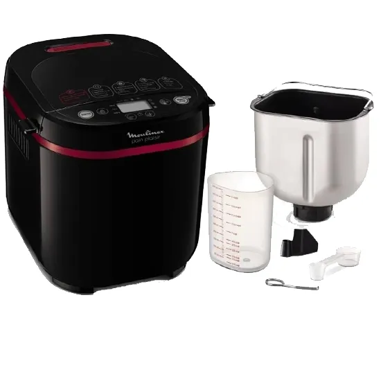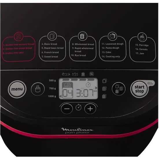 Potência: 720 W Peso do pão: 500g / 750g / 1000g Número de programas: 17 Programas “sem glúten”: 3 Programas “bem-estar”: 3 Receitas: 27 Acessórios standard (colher medidora, copo, gancho) Interface: Ecrã LCD Níveis de tostagem: 3 Início diferido: Até 15 horas Manter quente: 1 hora Aviso para adicionar ingredientes Revestimento cuba para pão: Antiaderente Forma da cuba: Quadrada Cores: Preto e Púrpura