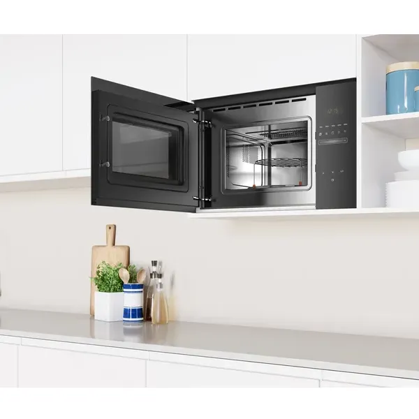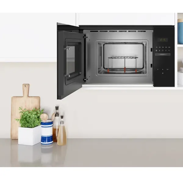Série Vidro Preto Microondas sem aro Instalação em armário superior de 60 cm de largura (mínimo 30 cm profundidade), coluna de 60cm de largura Abertura lateral à esquerda Controlo eletrónico Controlo deslizante totalmente integrado no vidro 20 l capacidade Prato rotativo 25.5 cm em vidro Aqualisis: sistema de limpeza simples, económico e ecológico Relógio eletrónico com programação de duração e fim de confeção Potência: 800 W Potência do grelhador: 1000 W. Funcionamento combinado micro-ondas + grill 5 níveis de potência: 800 W, 600 W, 360 W, 180 W, 90 W 8 programas automáticos de confeção e descongelação por peso 1 memória programável Interior em Inox Iluminação interior por LED Acessórios: Grelha, Prato rotativo