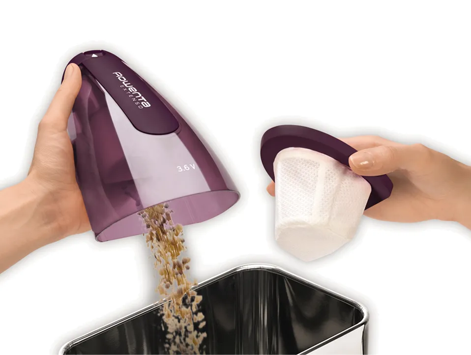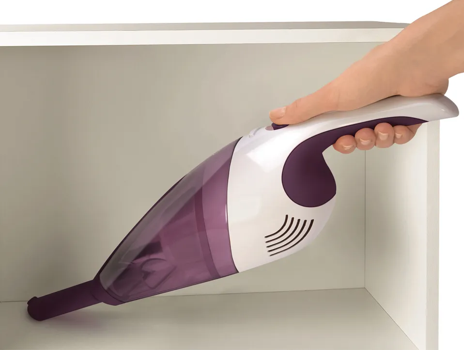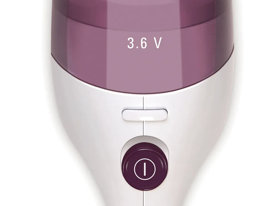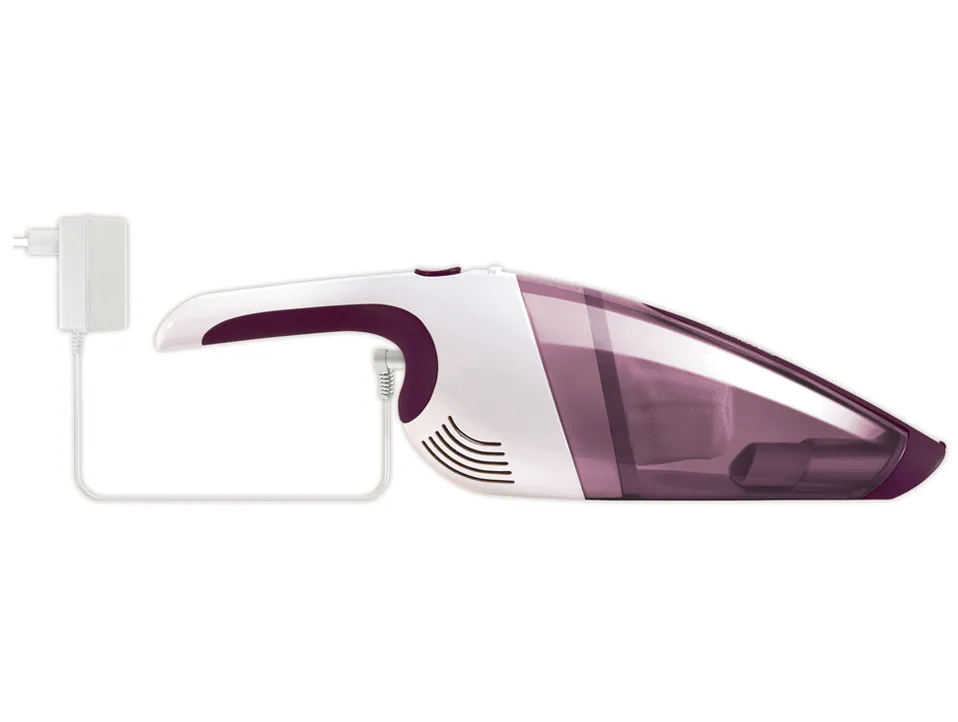 Mini-aspirador sem fio Dry Potência: 3.6 V Velocidades: 1 Autonomia: 10 min Tipo de bateria: NiMh Número de baterias: 4 Tempo de recarga: 16 h Tipo de recarga: Corrente elétrica Indicador de carregamento da bateria Capacidade do depósito: 0,35 L Filtragem: Filtro permanente lavável Nível de ruido: 77 dB(A) Pega ergonómica Fácil limpeza Acessórios incluidos: Escova telescópica; Escova para ranhuras; Escova para líquidos Cores: Translucent Purple/ White