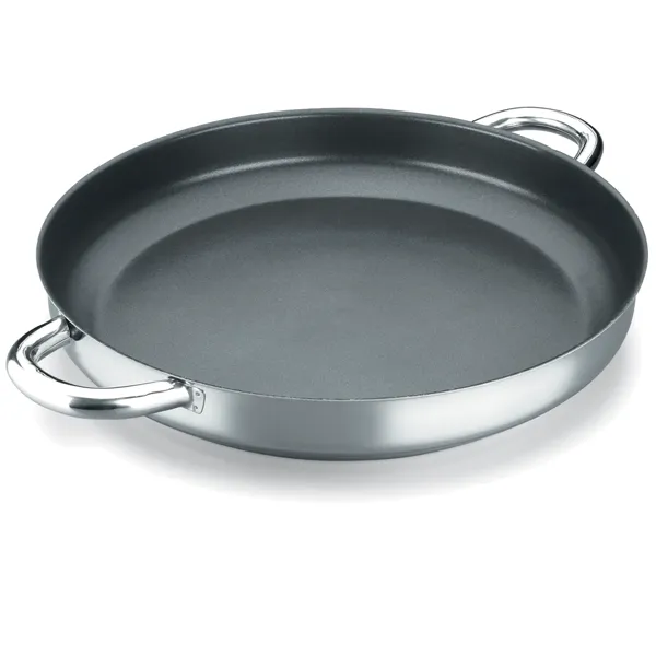 Paelheira com pegas metálicas em aço inoxidável e superfície antiaderente (base 28cm / parte superior 32cm). Para placas de indução, vitrocerâmicas e de gás. Diâmetro da base 28 cm. Parte superior 32 cm.
