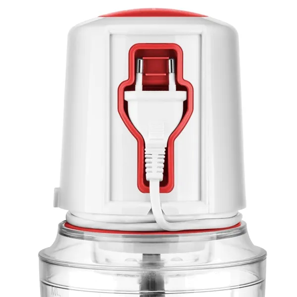 Potência: 500W 2 velocidades Capacidade: 800ml Lâmina dupla de aço inoxidável Armazenamento do cabo