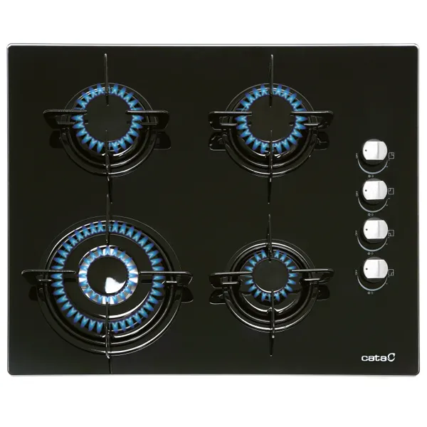 4 queimadores de gás: – esquerda cima: 1 semi-rápido de 1,75kW – esquerda baixo: 1 coroa tripla de 3,5kW – direita cima: 1 semi-rápido de 1,75kW – direita baixo: 1 auxiliar de 1kW Ligação eletrónica integrada no comando Válvulas de segurança Grelhas/Queimadores esmaltados Exclusivo Gás Butano Potência total 8 kW Dimensões (axlxp) 52x590x510mm
