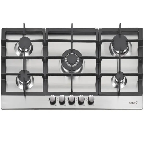 5 queimadores de gás: – esquerda cima: 1 rápido de 3kW – esquerda baixo: 1 semirrápido de 1,75kW – centro: 1 coroa tripla de 3,5kW – direita cima: 1 semirrápido de 1,75kW – direita baixo: 1 auxiliar de 1kW Ligação eletrónica integrada no comando Grelhas/Queimadores de ferro fundido Válvulas de segurança Preparada para Gás Natural Injetores de Gás Butano incluídos na embalagem Potência total 11 kW Dimensões (axlxp): 55x850x500mm