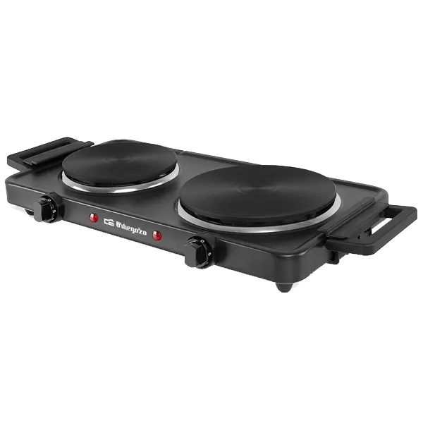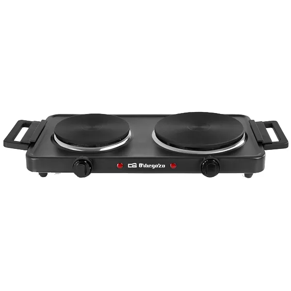 Potência: 2500 W. Superfície de cozedura: 155 mm e 185 mm de diâmetro. Potência: 1 x 1000 W + 1 x 1500 W. Alças dobráveis. 2 termostatos com intensidade ajustável. 2 luzes indicadoras. Sistema de segurança contra superaquecimento. Grande estabilidade Fonte de alimentação: 230 V – 50 Hz.