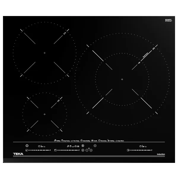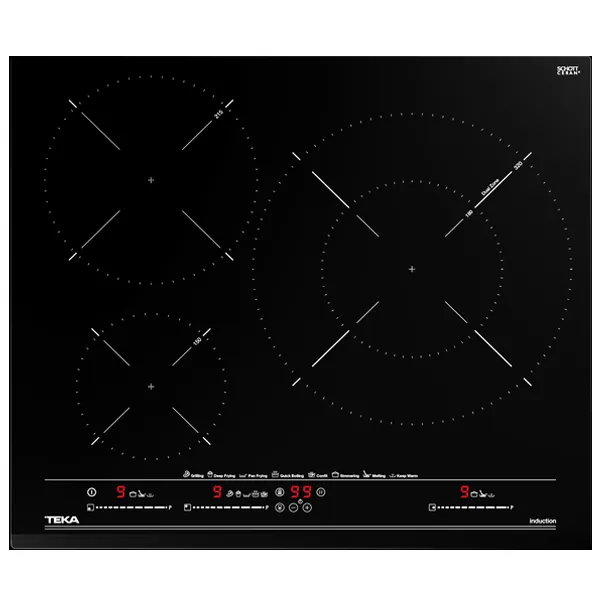 MasterSense Touch Control MultiSlider com bloqueio de segurança Programador do tempo de cozinhado 3 zonas de cozinhado 1 zona de Ø 150 mm 1 zona de Ø 215 mm 1 zona duplo circuito de Ø 185/320 mm Função Power Plus Função STOP & GO Função Mute Sistema de otimização de recipiente Vidro frontal biselado Schott Ceran (4mm) Indicadores de calor residual Desligar automático de segurança Fácil instalação com sistema Fast Click Medidas gerais (axlxp): 53x600x510mm