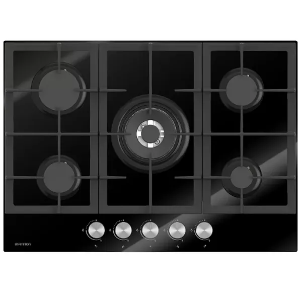 Nº de queimadores: 5 – Wok (tripla coroa) (kW): 1 x 3,80 – rápido (kW): 1 x 2,90 – semirápido (kW): 2 x 2,00 – auxiliar (kW): 1 x 1,00 Preparada para gás natural Kit de conversão para gás butano incluído Dimensões: 9,7x70x50cm Acabamento vidro preto Acendimento eletrónico Segurança termopar em cada queimador Grelha ferro fundido Comandos frontais em aço inoxidável Limpeza fácil Cor: Vidro Preto