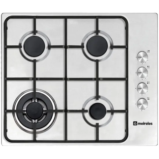 Placa a gás com 60cmAço inoxidável4 queimadores a gásQueimador WokAcendimento electrónicoVálvulas de segurançaManípulos lateraisGrelhas em esmalteGás butano/propano