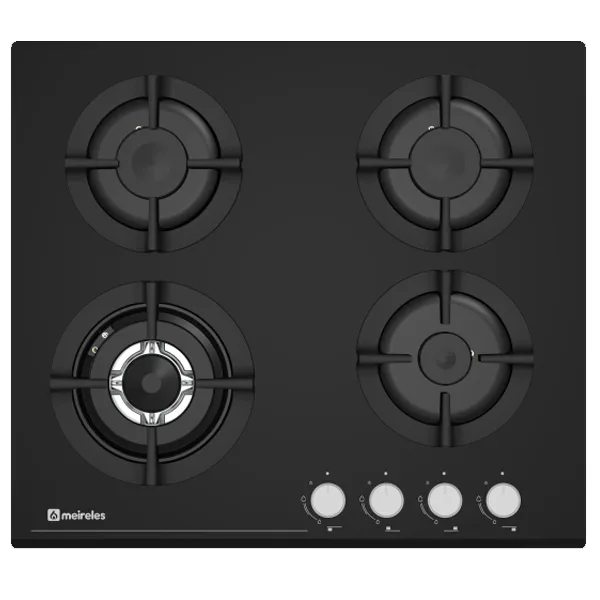 Placa cristal gás com 60cm 4 queimadores a gás Queimador wok Acendimento electrónico Válvulas de segurança Manípulos frontais Grelhas em ferro fundido Dimensões (lxp): 590x520mm