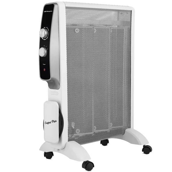 Elemento de aquecimento mica. Rápida convecção e difusão de calor. O desempenho máximo em 1 minuto. Não consume oxigénio. Dispositivo anti-queda Termostáto ajustável. Protecção contra o sobreaquecimento. Sem fluido. Piloto luminoso de funcionamento Recolhe cabos 2 potências de calor: 500W – 1500W. Rodas incluídas. Tensão 230 V. Potência 1500 W. Dimensões 460x615x80mm Tensão: 230V – 50Hz