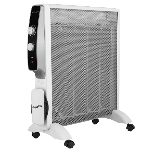 Elemento de aquecimento mica. Rápida convecção e difusão de calor. O desempenho máximo em 1 minuto. Não consume oxigénio. Dispositivo anti-queda Termostáto ajustável. Protecção contra o sobreaquecimento. Sem fluido. Piloto luminoso de funcionamento Recolhe cabos 2 potências de calor: 1000W – 2000W. Rodas incluídas. Tensão 230 V. Potência 2000 W. Dimensões 550x615x80mm