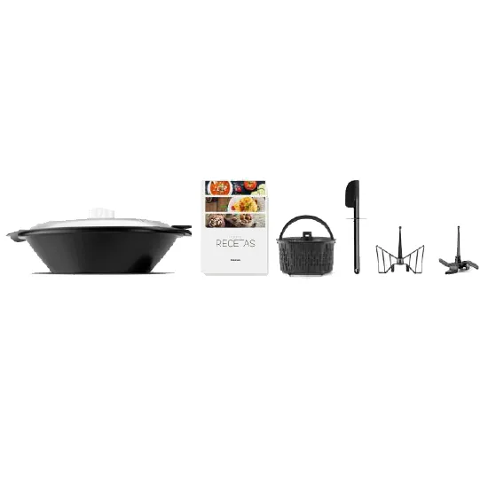 1500W Visor digital LCD muito intuitivo Controle de temperatura de 30ºC a 120ºC Seletor de tempo até 90 minutos Jarro de aço inoxidável de grande capacidade: 3.5L Cozedura a vapor a 2 níveis, capacidade total de 3L Lâminas em aço inoxidável 12 velocidades de corte da lâmina Função Pulse, velocidade máxima Balança integrada de alta precisão Desliga automáticamente Proteção de segurança avançada Todas as peças plásticas são isentas de BPA Acessórios e jarras para máquina de lavar louça Base estável e antiderrapante com ventosas Configurações de cozedura totalmente personalizáveis Inclui livro de receitas e os seguintes acessórios: espátula, cesto de ferver, borboleta, vaporizador e copo medidor.