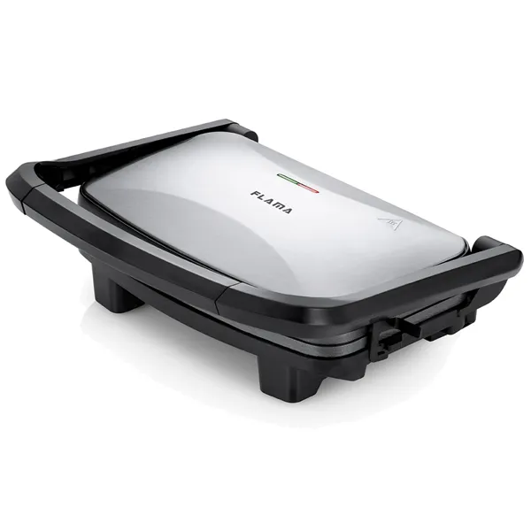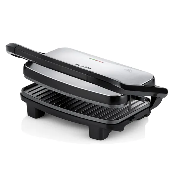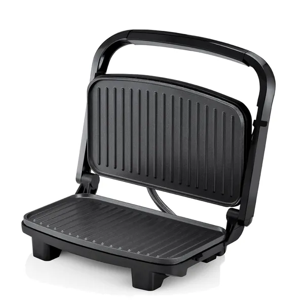Potência: 1000W Placas grill com revestimento antiaderente Dimensão da placa: 26×15,4cm Capacidade: 2 sanduíches Fecho de segurança Corpo frio em axo inoxidável Indicador luminoso de funcionamento Enrolador de cabo integrado