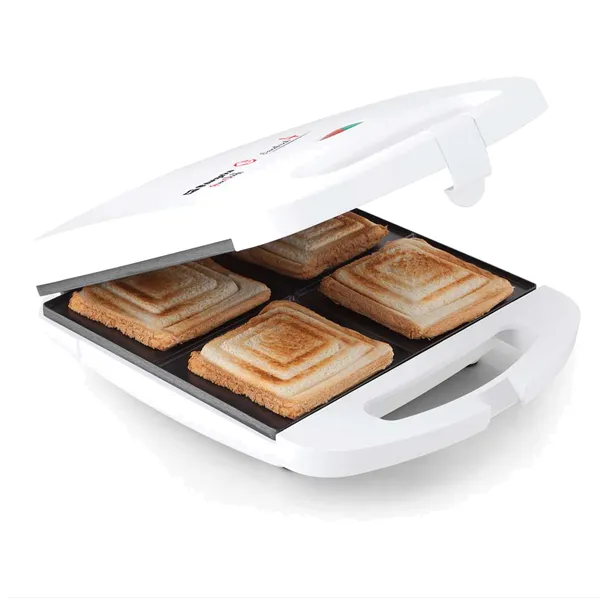 Potência: 1500W 4 sandwiches Revestimento antiaderente Tostado uniforme Sandwiches perfeitamente seladas Piloto luminoso de funcionamento e temperatura ótima Fácil de limpar Base antiderrapante Arrumação na vertical e horizontal Proteção contra sobreaquecimento Conexão: 230V ~ 50Hz