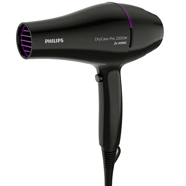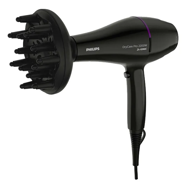 Regulação ThermoProtect Cuidado iónico: 2 vezes mais iões Jacto frio Gancho de arrumação Regulações de calor / velocidade: 6 Voltagem: 220 V Frequência: 50-60 Hz Potência: 2200 W Comprimento do cabo de alimentação: 2 m Motor: CA Velocidade de secagem: 130 km/h Cor/Acabamento: Preto e violeta Acessórios: Cabeça de 9mm; Difusor de volume