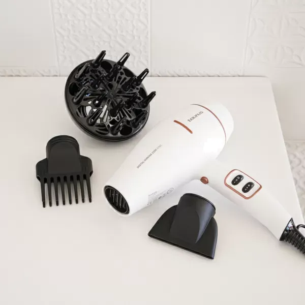 Potência: 2200W Motor digital Tecnologia iónica, evita o frizz Fluxo de ar: +160 km/h 2 velocidades 3 temperaturas Sopro de ar frio Protecçáo contra o sobreaquecimento Anel de pendurar