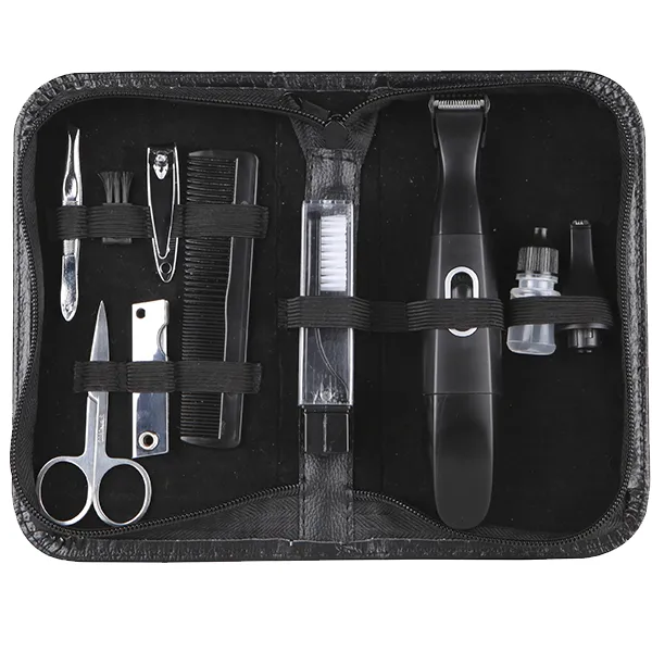 Estojo que inclui: pente, tesoura, óleo, kit manicure, escova de dentes, pinça, corta unhas, escova para limpeza. Aparador pelos, cabeça, perfil e cabeça aparadora com 5 posições. Corta os pelos de qualquer parte do corpo. Funcionamento seco-húmido. Funciona com 1×1.5 V AA