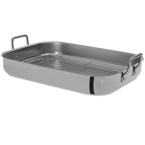 Aço inoxidável (acabamento polido). Dimensões: 36,8 x 27 x 5,5cm Altura: 5,5lts Função: Assar / Gratinar