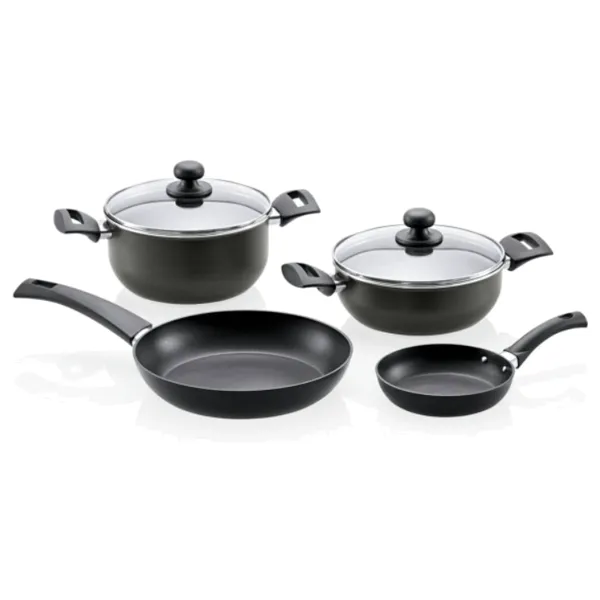 Todas as peças contam com revestimento antiaderente, cabos/pegas em baquelite preto e corpo em alumínio.
