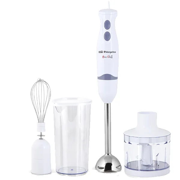 Corpo ergonómico Interruptor de tacto suave Selector de velocidades 2 botões 2 velocidades Argola para suspensão Pé em aço inox Braço desmontável em aço inox Batedor de arame Copo misturador e medidor 600 ml Picador universal com tampa 500 ml Potência 400W Ligação: 230 V – 50Hz.