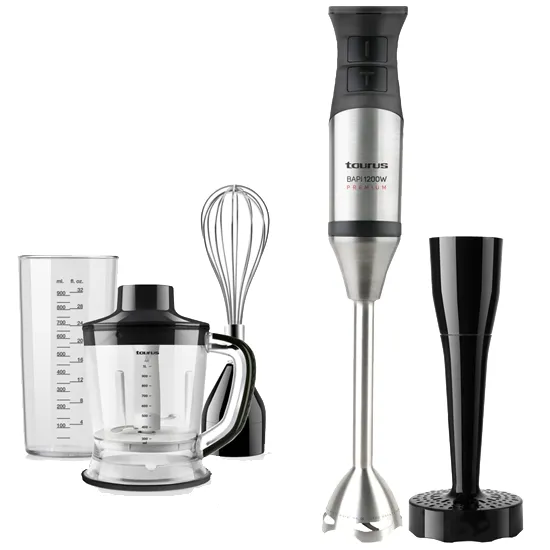 Potência: 1200W 20 velocidades Função turbo para potência máxima Sistema de rotação turbo. Sistema melhorado de circulação de alimentos Lâminas de aço inoxidável de alto desempenho e duplo efeito: Batem e picam Pica gelo Design ergonómico com pega soft-touch Varinha de aço inoxidável de alta resistência Bordo com design anti-salpicos Varinha e acessórios livres de BPA Acessórios aptos para lavagem na máquina Inclui: copo medidor, picadora, emulsionador e passa puré