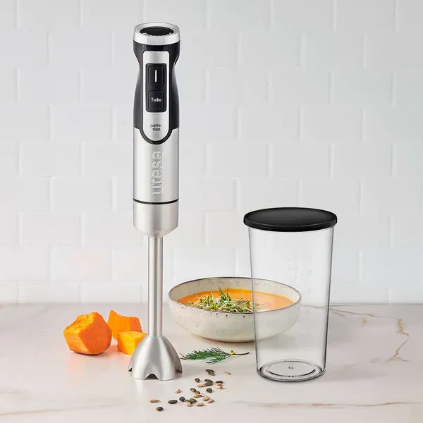 Ecra LCD Controlo de velocidade Função turbo 4 lâminas de alta eficiência Ergonómico Design anti-respingos Copo de medição Potência: 1500W